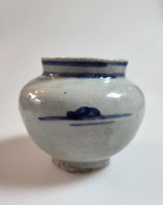구연에는 청화로 선을 둘렀고 동체에는 대나무 잎문과 바위와 언덕을 간결하게 생략해서 표현한 모습입니다