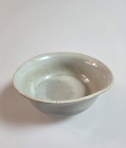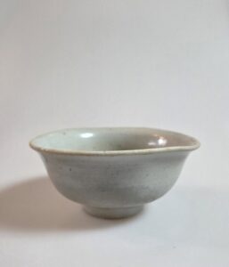 조선 전기 관요사기 조선백자 찌글이 다완으로, 형태는 잔 입구 부분이 찌그러져 있어 독특한 인상을 줍니다
