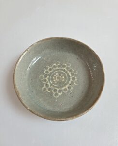 조선시대 14~15세기경에 만들어진 분청사기 백상감 국화문 접시입니다