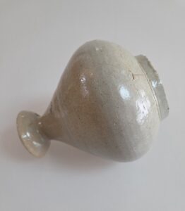 태토는 정제도가 높고 치밀하여 수비가 잘되었으며 소성 과정에서 강한 불을 맞아 굽 저부에 태토가 자연스럽게 갈라졌지만 내부에는 유약이 시유가 되어있어 물이 새지는 않습니다