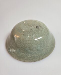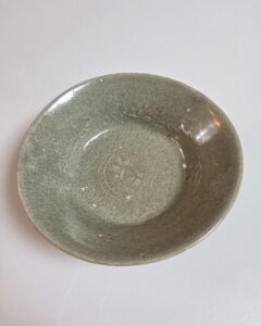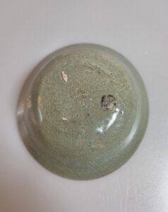 고려초기에 만들어진 기물로서 비색이 일색으로 들어갔고 화문 도안이 양각으로 내저부부터 전체적으로 들어갔습니다 굽에는 규석 받침으로 되어있어서 기물의 격을 높이고 있습니다