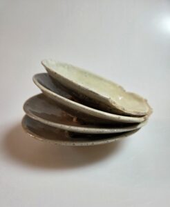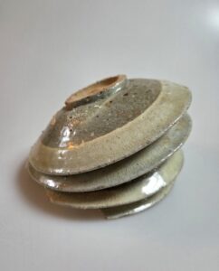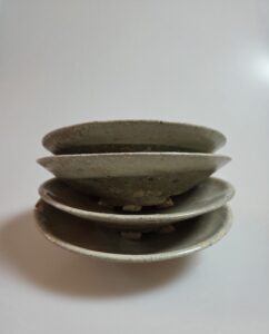 무려 네 점의 접시가 서로 융착된 상태이며, 그중 두 번째 접시는 다른 도편들과 붙어 있음에도 완벽한 형태를 유지하고 있어 조선 전기 반덤벙 제작 방식과 당시의 소성 기술, 그리고 미감을 고스란히 전해줍니다.