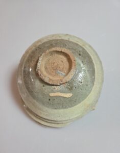 굽 접지면에 내화토를 받쳐 여러 점을 포개어 소성하는 과정에서, 고온의 불길 속 유약이 녹아내리며 서로 유착되어 하나의 형태로 굳어진 소성의 흔적을 보여줍니다.
