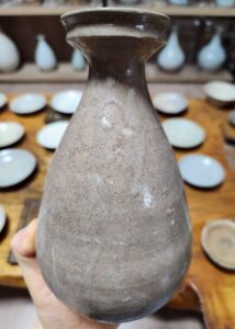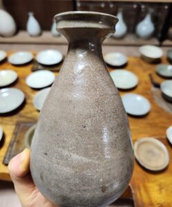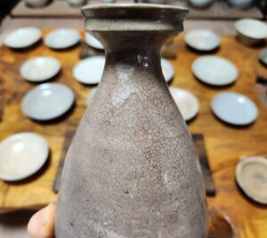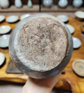 전체적으로 비파색을 띄고 있으며 이도유약 같은 하얀유약 뭉침이 좋고 흐르는 빙렬 안으로 작은 빙렬이 터져있고 자연스러운 세월의 흔적에 고태미가 좋습니다