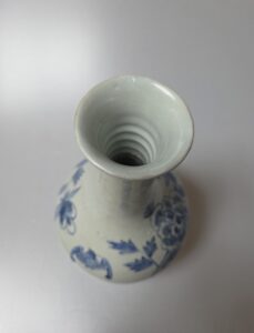 몸통을 돌아가며 휘어감은 듯한 모란을 전면에 배치하고 박쥐를 청화안료로 그려 넣었는데. 섬세하게 묘사된 문양은 깨끗하고 흰 바탕과 조화를 이루어 한층 정갈해 보입니다