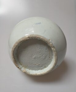 굽 인바닥을 깊게 깎아낸 다음 접지면의 유약을 닦아내고 고운모래를 받쳐 구웠습니다