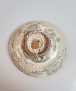 내저부 중심에 십자문을 중심으로 선문과 승렴문이 정제된 수비태토 위에 시문되었고 그 위로 귀얄이 시유되어 장식성을 더하였습니다