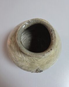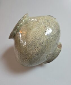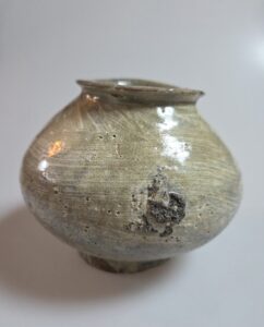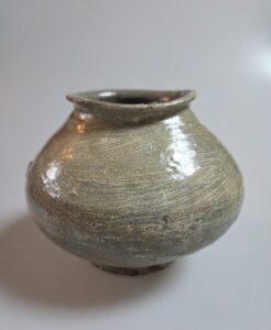 연질 태토로 소성 과정에서 불길을 강하게 받아 구연부가 자연스럽게 일그러지며, 인위적이지 않은 와비사비적 미감을 잘 보여줍니다