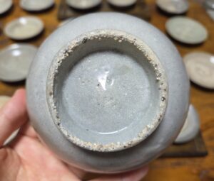안정감 있는 관요굽으로 가는 모래받침으로 번조하였습니다