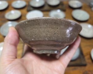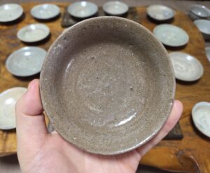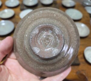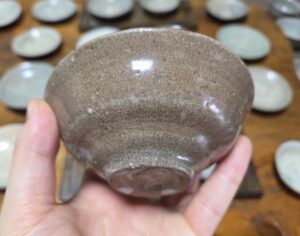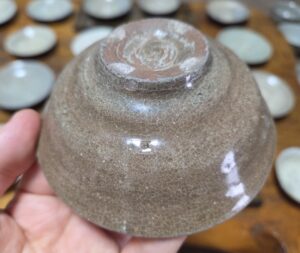 굽 저부는 내화토 받침 위에 놓고 소성된 흔적이 있으며 쇼바형 굽 형태를 갖추어 조형미가 좋습니다