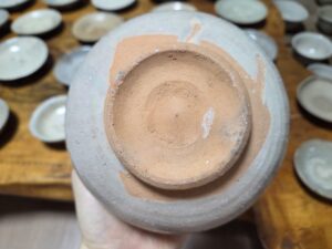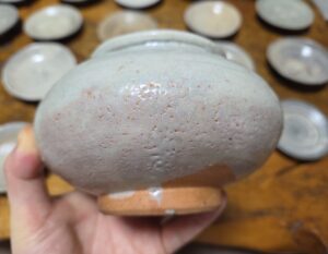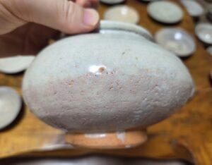 소로본가다 형태로서 동체가 풍만하게 부풀고 저부에서 매끄럽게 조여지는게 바둑알을 연상케 합니다