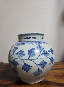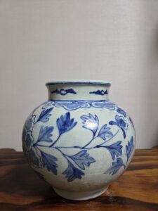 전체적으로 풍만한 몸체, 완만하게 곡선진 어깨선 형태를 띠며, 외면에는 청화로 모란문이 화려하게 장식되어 있습니다.
