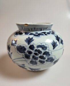 모란 도안이 앞뒤로 시문되었으며, 수입 청화코발트를 사용하여 청화 발색이 선명하며