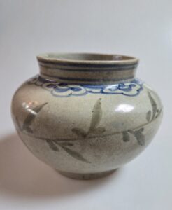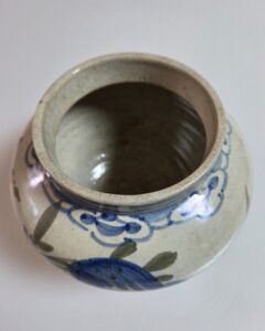 굽의 접지면은 가는 모래받침으로 번조하였으며 몸통에 불수문은 청화와 녹색안료를 사용하였고 구연부는 직립되었고 청화로 선문이 두줄 들어가있습니다