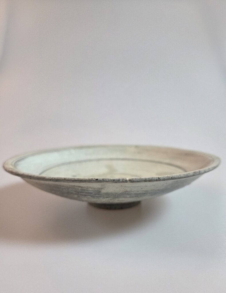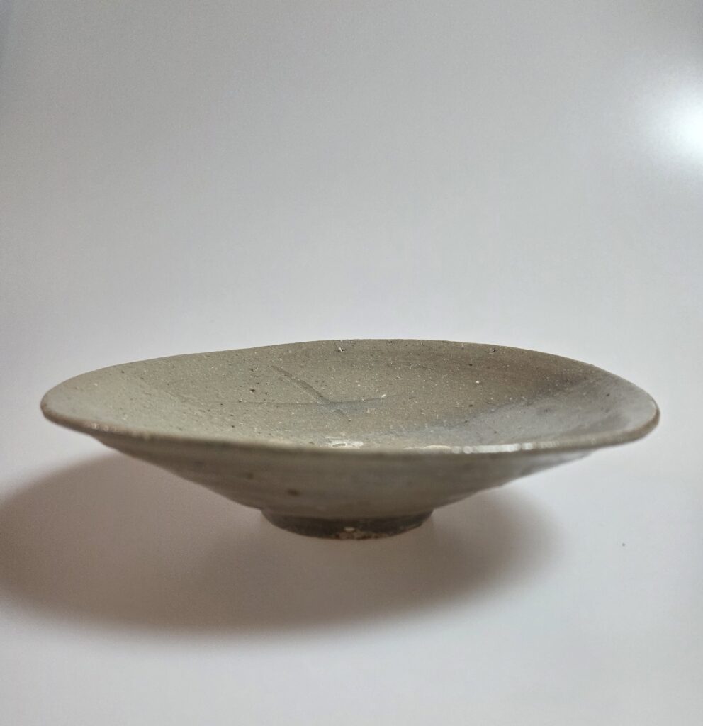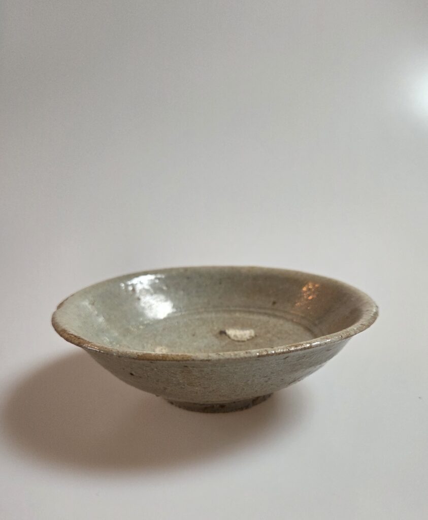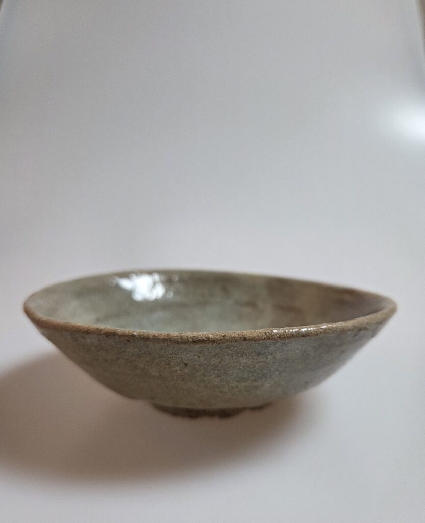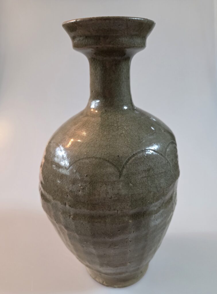 고려시대 전기(10~11세기) 고려청자 참외골 광구병입니다 광구병은 목에 비하여 입구가 넓은 병으로, 이 기물은 목이 긴 광구(넓은 입) 형태에 풍만한 몸체, 전면에 반복되는 참외골 형태의 음각선 문양이 돋보이는 기물입니다 특이하게도 도공이 한쪽 면을 의도적으로 눌러 편병을 연상시키는 비대칭 형태를 만들어냈으며, 이는 조형적 재미를 더합니다. 보통 고려시대 전기 광구병은 황청자 계열이 많은데, 본 기물은 탁한 비색을 띠며, …