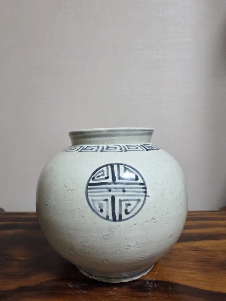 이 기물은 조선 19세기 관요에서 제작된 청화백자 수자문 호 입니다 전체적으로 달항아리를 연상시키는 둥글고 풍만한 몸체를 가지고 있으며,  어깨에는 회자문이 둘러져 있습니다. 몸통에는 네 면에는 창살형 도식화된 수(壽)자문이 들어가 있어 장수와 길상을 기원하는 뜻을 담고 있습니다. 굽 바깥에는 관요에서 사용하던 청화 선문이 둘러져 있고 굽 바닥에는 ‘上’ 음각되어 있습니다 조선 도자기에서 굽 바닥에 새겨진 ‘上’ …