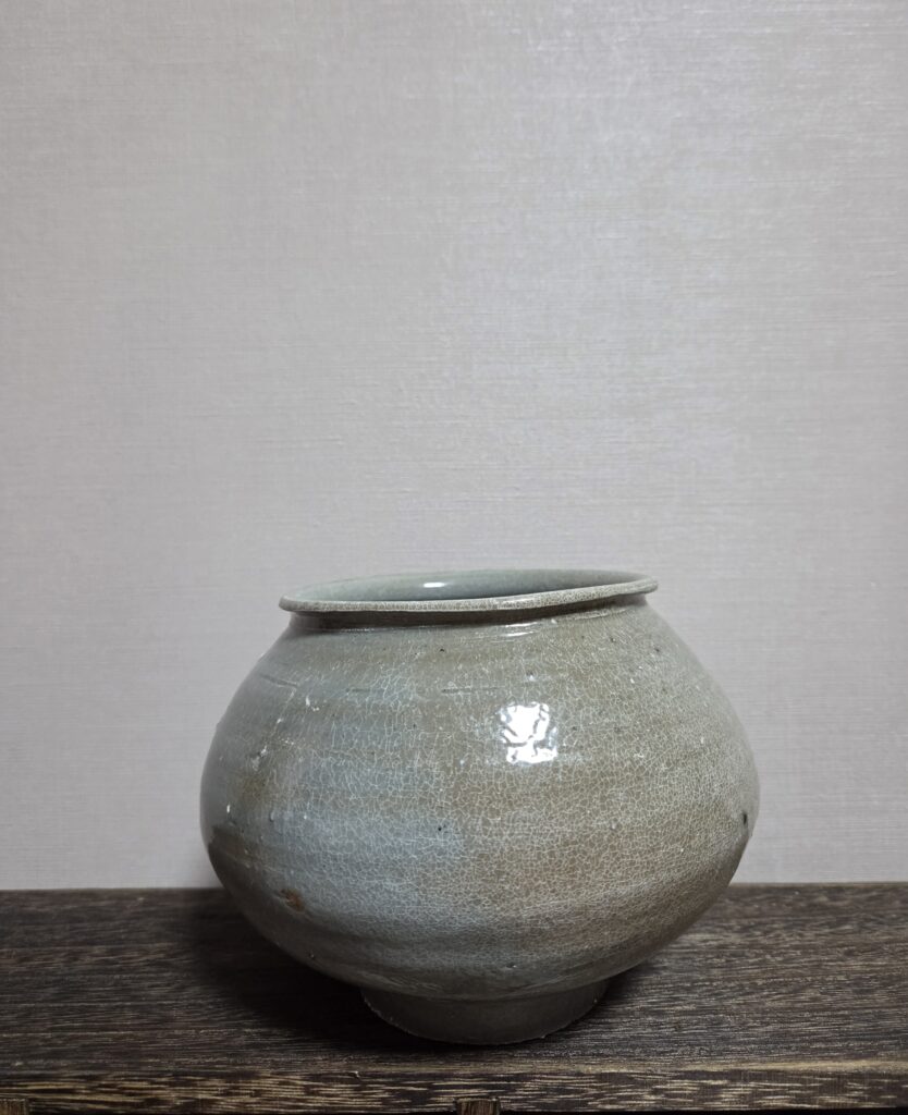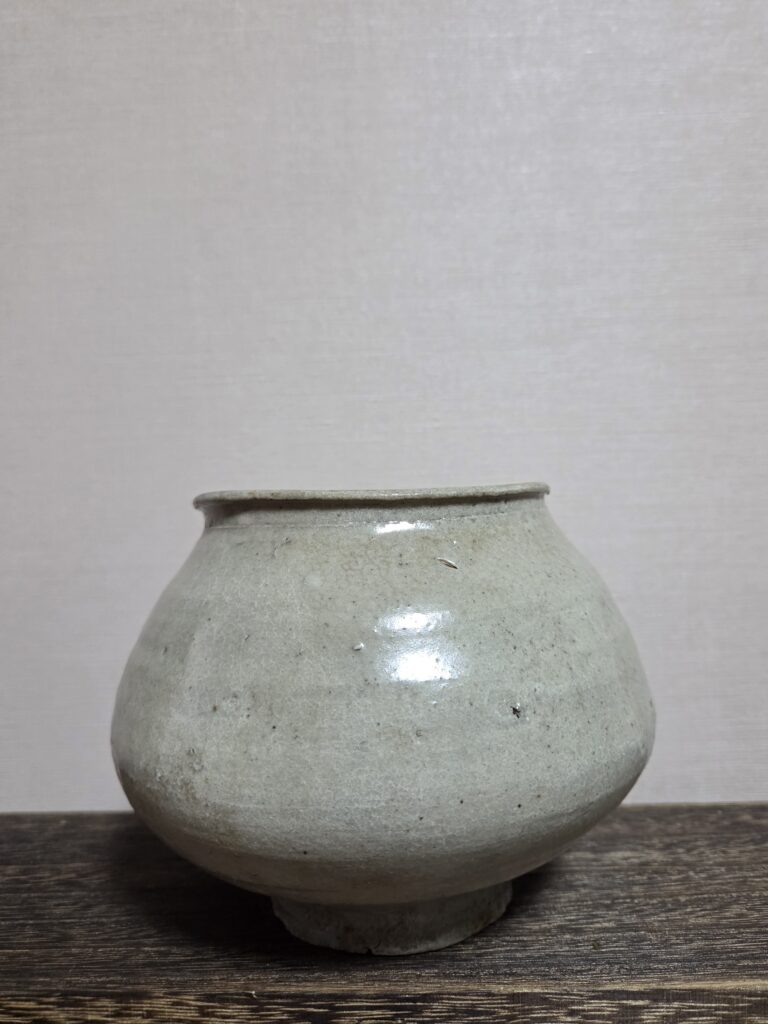 조선 전기 경남 웅천 지역에서 제작된 조선백자 호 입니다 짧은 구연부가 안쪽으로 말려들며, 넓고 둥근 동체와 죽절굽이 어우러진 전형적인 조선 전기 백자호의 형태를 띠고 있습니다 동체는 풍만하면서도 저부로 갈수록 매끈하게 수렴되는 곡선미와 맵시가 좋습니다 표면은 회청색 또는 회백색 계열의 투명 유약으로 시유되었고 잔잔한 빙열이 전체적으로 퍼져 있어 운치를 더합니다 굽 바닥에는 매화피가 필듯 말 듯한 …