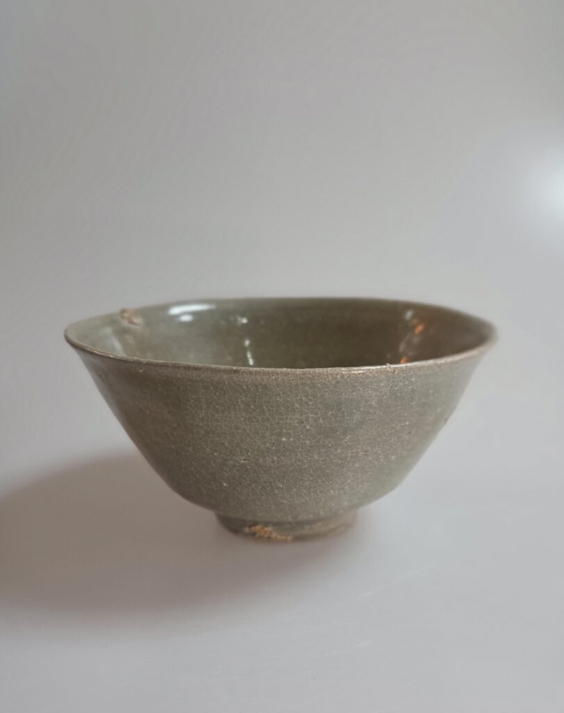 고려말 조선초에 제작된 고려청자 다완입니다 일반적인 고려 사발과 달리 구연부가 과하게 벌어지지 않고 사선으로 힘 있게 뻗어 올라오는 기형으로, 조선 다완으로 이어지는 과도기적 형태를 잘 보여주는 작품입니다. 굽은 단정하게 깎아 안정감이 좋으며, 내저부에는 내저원이 남아 있습니다. 유색은 전반적으로 차분한 비색을 띠며 부분적으로 자연스러운 요변이 어우러져 깊이 있는 경치를 보여줍니다. 제원 : 구연부 16.2cm x 높이 …