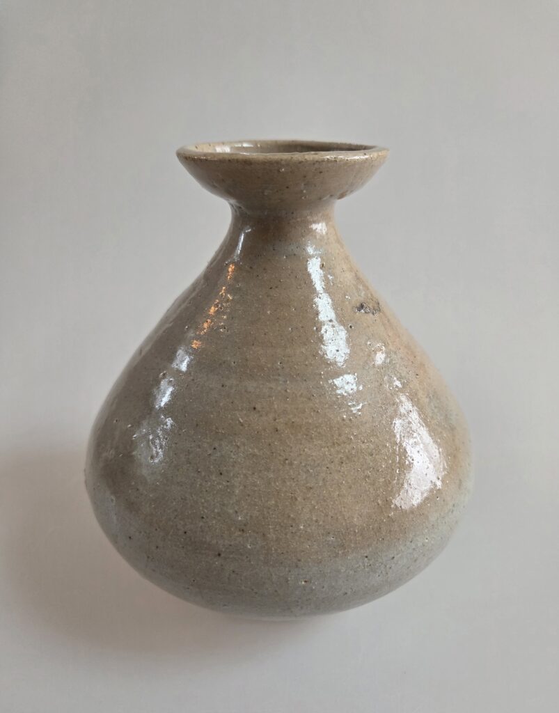 조선시대 중기에 제작된 관요사기 주병으로 도쿠리병형태입니다 구연부가 넓게 벌어지고 목이 짧은 광구병 형태를 가지고 있고 동체는 저부로 갈수록  풍만한 형태를 보이며 전체적으로 유려한 곡선미를 보여줍니다. 회백색 바탕위에 산화소성과 요변으로 인한 색상 변화로 마치 저녁노을을 연상케하여 기물의 경치가 뛰어납니다 태토는 정제도가 높고 치밀하여 수비가 잘되었으며 소성 과정에서 강한 불을 맞아 굽 저부에 태토가 자연스럽게 갈라졌지만 내부에는 유약이 …