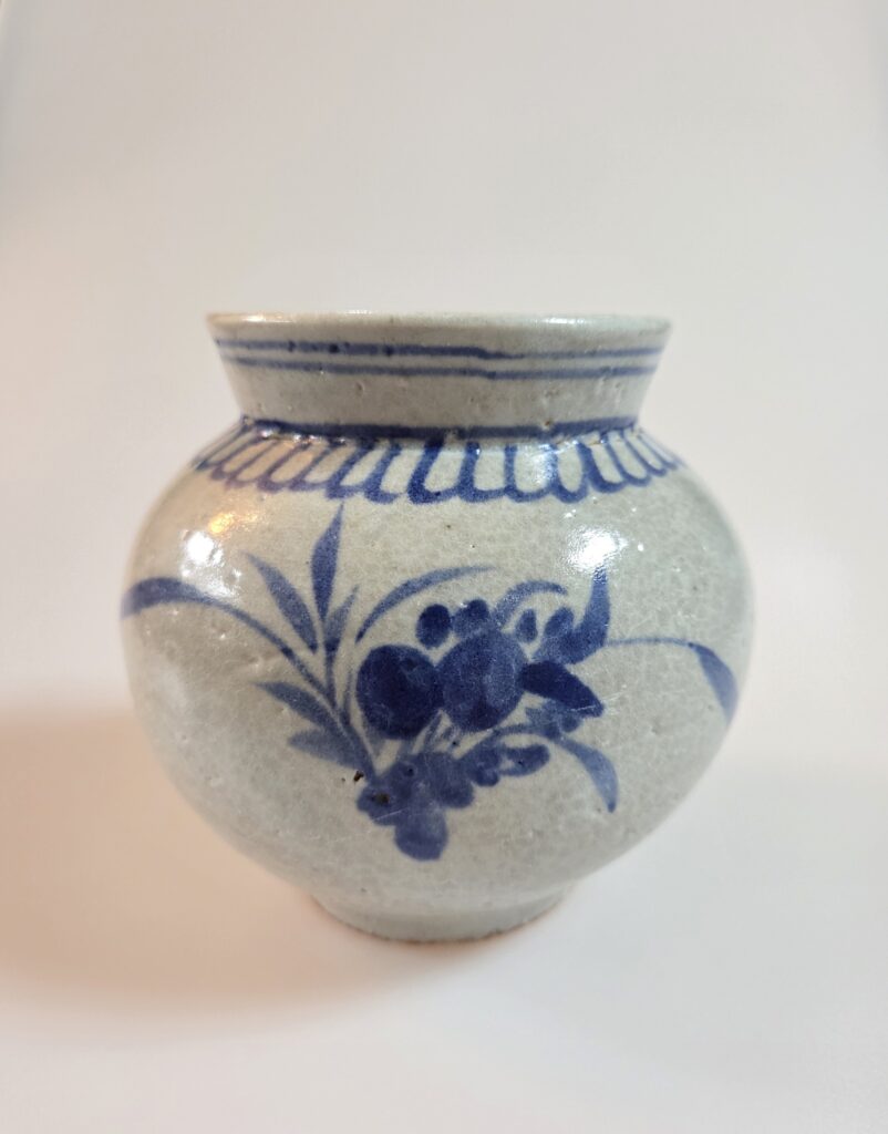 조선시대 말기 관요사기 분원에서 제작된 청화백자 괴석의난문호 청화의 안료를 사용하여 괴석의 난초 도안이 번짐없이 자화가 잘 구연되었고 정제된 태토로 수비가 잘 이루어진 기물입니다 백여 년이 넘는 세월 동안 실사용의 흔적과 자연스러운 태착으로 고태미가 더해졌으며 전체적으로 회백색으로 나왔고 모래받침으로 번조를 하였습니다 제원 : 구연부 9cm x 높이 13cm 전체적으로 안정적이 형태미와 세련된 조형미를 보여줍니다 유 튐 …