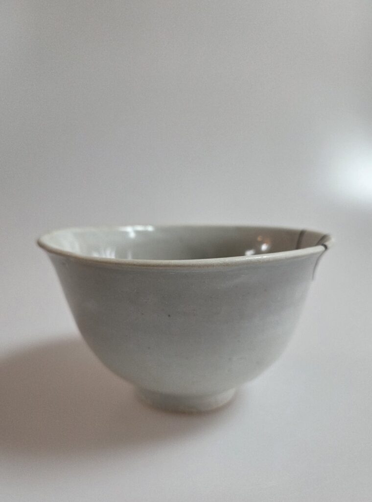 조선시대 초기에 제작된 조선백자다완 제원 : 13.5~14cm, 높이 5.5cm로 실제 다완 중에서도 손에 잘 들어오는 안정적인 사이즈입니다 구연부가 살찍 찌글어진 듯한 비대칭미가 있어 자연스러운 와비사비적 미감이 살아있습니다 태토 비짐받침으로 번조하였고 잘 정제된 태토를 사용하여 잡티나 불순물이 거의 보이지 않습니다 푸른 기운이 도는 담청색 유약이 시유되었으며, 연질태토로 크고 작은 빙렬들로 사용할수록 변화가 기대되는 기물입니다 전체적으로 단정한 …