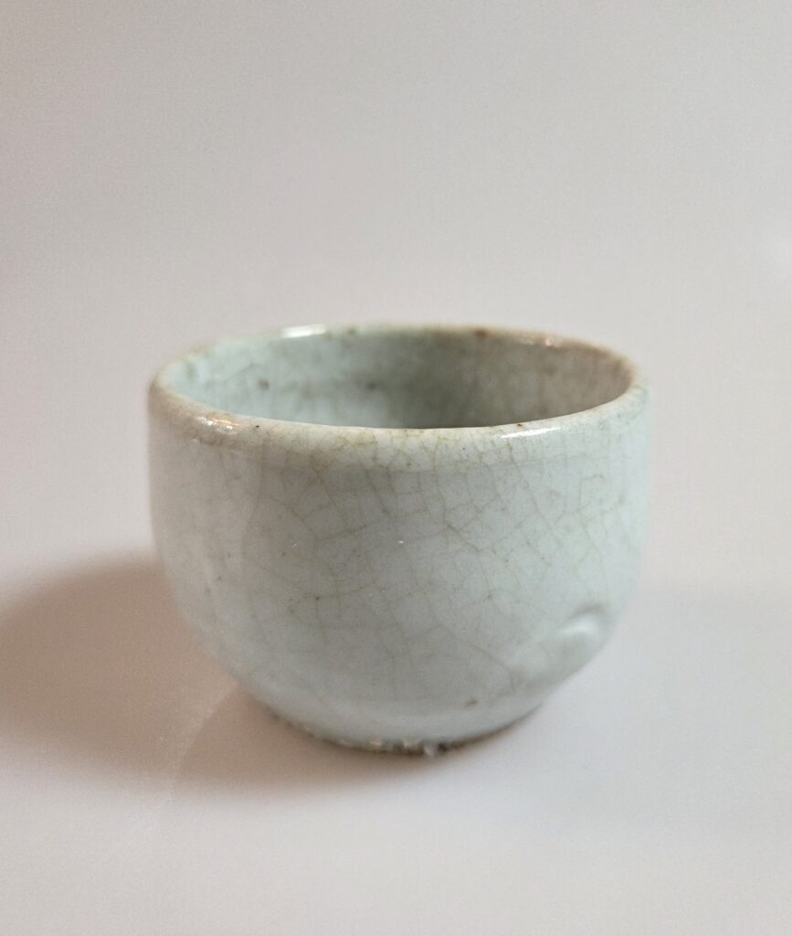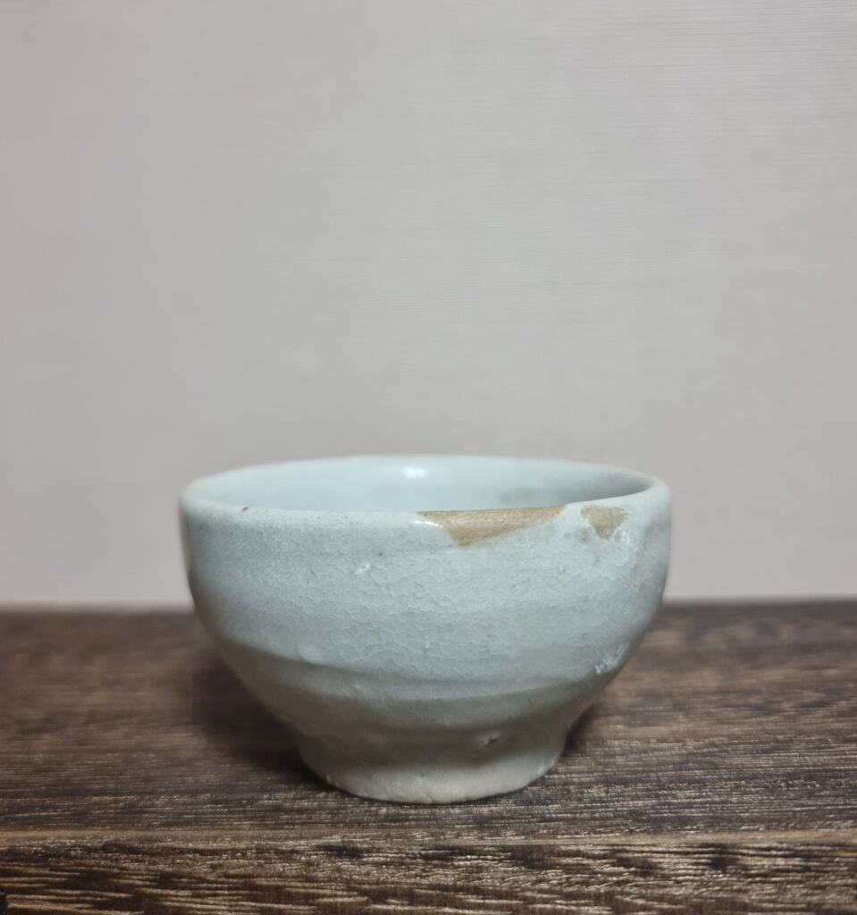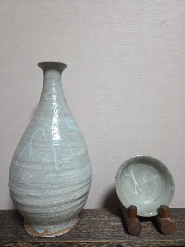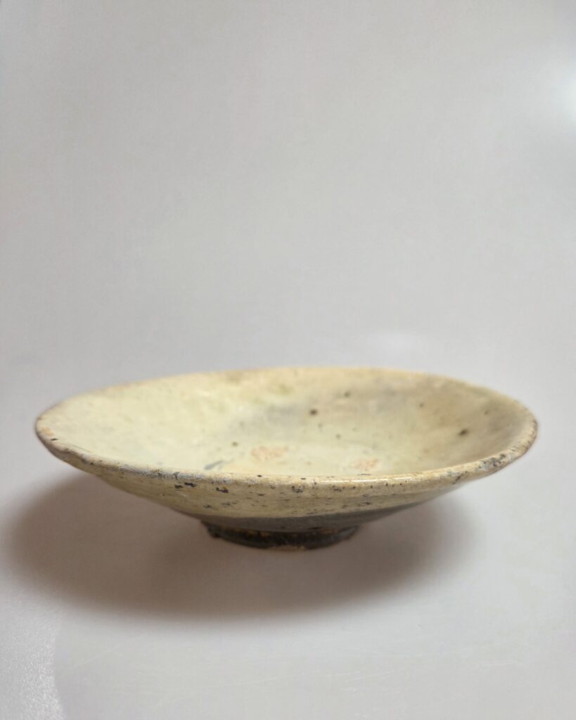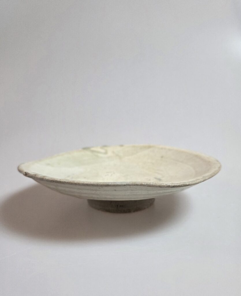 조선시대 초기 전라도 지역에서 제작된 분청사기 반덤벙 접시입니다 특히 이 기물은 무안, 운대리 계통 가마에서 보이는 반덤벙 특징이 잘드러나 있습니다 구연부는 자연스럽게 일그러진 형태를 이루며, 마치 산길처럼 굽이진 선이 와비사비적 미감을 드러냅니다 연질 태토로 제작되어 소성 과정에서 불길을 잘 받아 자화가 고르게 이루어졌고, 표면에는 은은한 광택을 보이고 있습니다 반덤벙 기법으로 분장이 두텁게 시유되었고, 내화토 받침으로 …