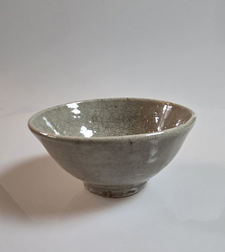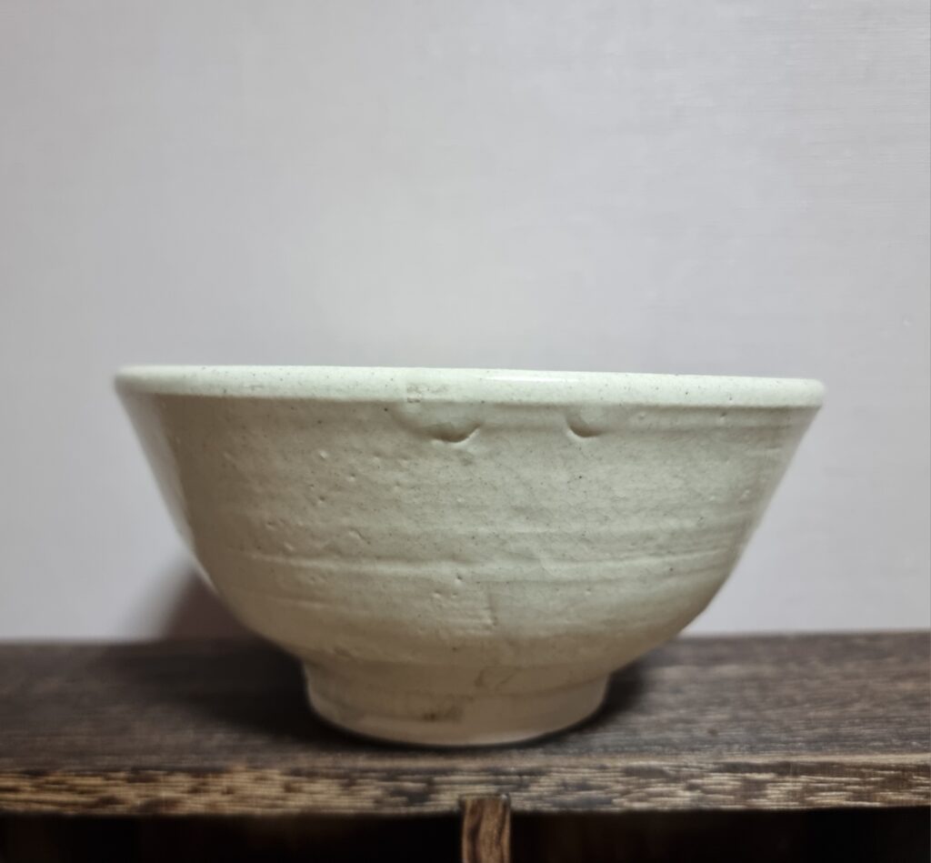 조선시대 후기 구만리 지역에서 만들어진 조선백자다완 전체적으로 은은한 회백색을 띠고 있으며, 소성 과정에서 불을 고르게 맞아서 자화가 잘되어 글라스 유약이 흘러내리면서 생긴 빙렬들 사이로 자연스러운 태착이 더해져 고태미가 더욱 깊게 배어 있습니다 굵은 모래 받침으로 번조되었으며, 굽 바닥까지 유약이 시유되었습니다 유약은 견수이지만 연질태토로 이루어져 있어 사용할수록 기품 있는 다완으로 변모할 가능성이 큽니다 제원은 구연부 지름 …