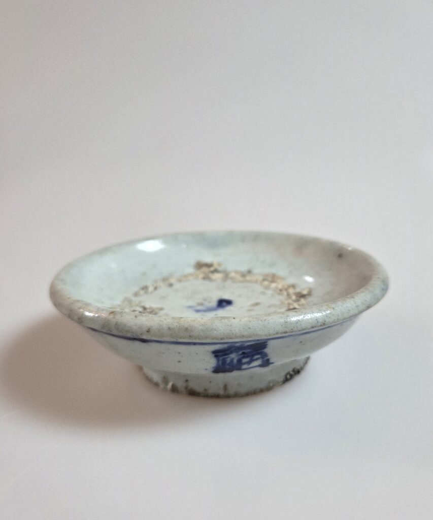조선시대 19세기 분원에서 제작된 관요사기 청화백자 접시입니다 청화안료를 사용하여 내저부에는 도식화된 추상적인 도안이 시문되었습니다 바깥굽 보다 안굽이 더 깊은 전형적인 19세기 기물입니다 제원 : 구연부 9.8cm x 높이 2.9cm 유 튐 수리없이 상태완벽합니다 판매가 24만원