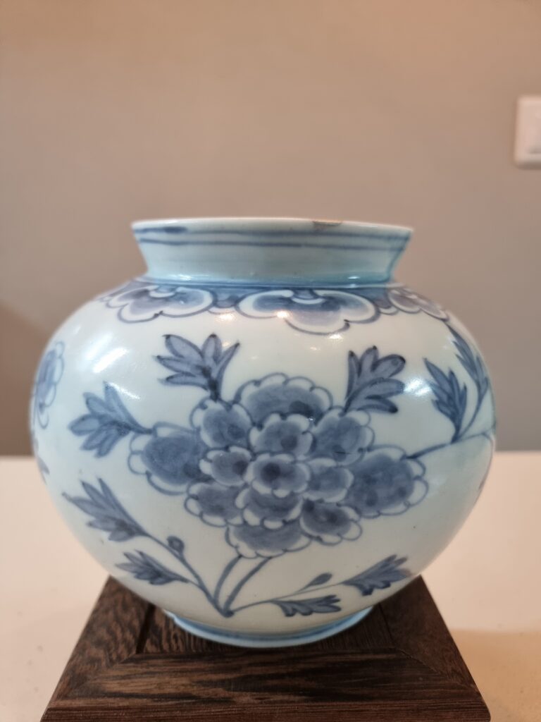 19세기 분원 관요사기 청화백자 겹 목단호 겹목단은 왕실에서 사용되어졌다고 알려져있습니다. 특히 굽에는 安 명문이 들어갔으며, 안동별궁이라는 왕실에서 사용한 목단문 호 입니다. 재원 구연부 10.2cm 높이 15cm 로서 존재감이 좋고 백자 색과 청화발색이 특급입니다. 구연부 미세 튐에 은수리가 되어 있지만 기벽은 완벽하게 살아있습니다 . 고도갤러리 추천기물입니다