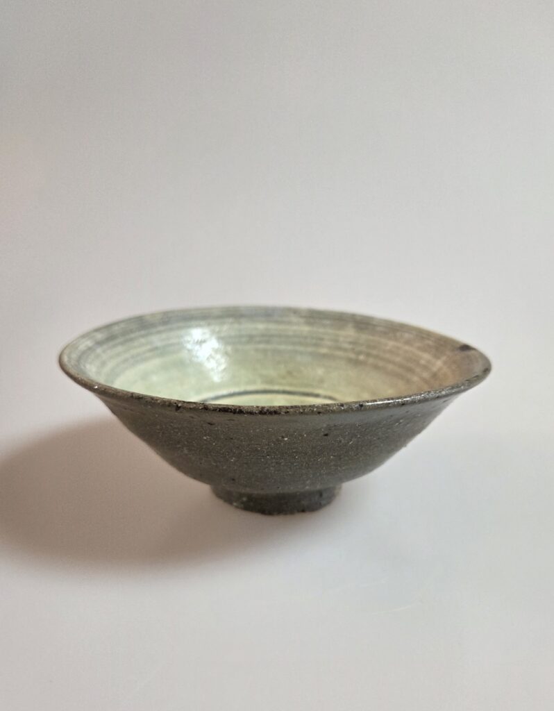 조선시대 초기 계룡산지역에서 만들어진 분청 귀얄다완입니다 구연부 13cm x 높이 5cm 로서 다완으로서 사용하기 좋은 재원을 가지고 있습니다 기측선을 따라 내저부부터 전까지 귀얄이 힘있게 사선으로 빈틈없이 들어갔습니다 죽절굽으로 굽 바닥에는 배꼽이 형성이 되어 비례미와 안정감을 더욱 높이고 있습니다 내저부에는 물레 성형 과정에서 자연스럽게 형성된 소용돌이 흔적의 차고임자리가 좋습니다 상태는 구연부 미세튐 1곳에 금수리가 되어있습니다 계룡산 …